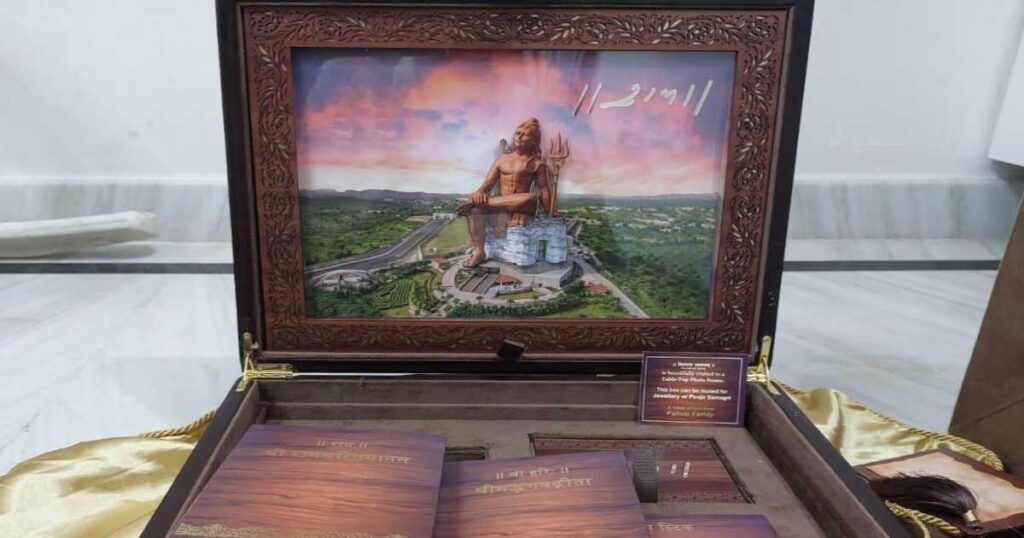 शाही शादी के इस कार्ड में दुनिया की सबसे ऊंची शिव प्रतिमा विश्वास स्वरूपम की एक तस्वीर भी है जो इसे और भी खूबसूरत बना रही है. यह कार्ड मांगलिक आयोजनों के बाद भी काम का है. इसकी इसमें साफ तौर पर जानकारी दी गई है कि लकड़ी के इस खूबसूरत बॉक्स को बाद में पूजन सामग्री या ज्वेलरी बॉक्स के रूप में काम में लिया जा सकता है.