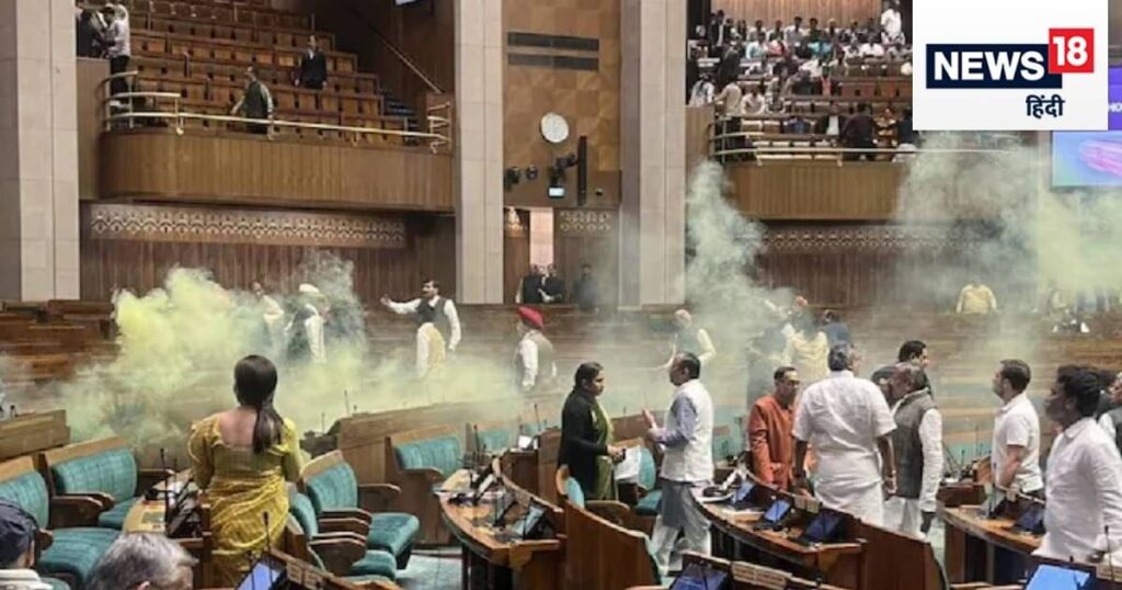 नई दिल्‍ली. साल 2001 में हुए संसद हमले के 22 साल बाद आज उसकी बरसी पर लोकसभा में एक बड़ी चूक का मामला सामने आया है. संसद की की कार्यवाही के दौरान बुधवार को दर्शक दीर्घा से दो लोग सदन के भीतर कूद गए और उन्‍होंने धुआं फैला दिया, जिसके बाद कार्यवाही अचानक दोपहर दो बजे तक के लिए स्थगित करनी पड़ी. घटना के तत्काल बाद दोनों व्यक्तियों को पकड़ लिया गया. लोकसभा अध्यक्ष ओम बिरला ने बताया कि लोकसभा अपने स्तर पर जांच कर रही है और इस बारे में दिल्ली पुलिस को भी निर्देश दिया गया है. उन्होंने यह भी कहा कि जो धुआं सदन में फैलाया गया था वह साधारण था और इसको लेकर चिंता कोई बात नहीं है.
