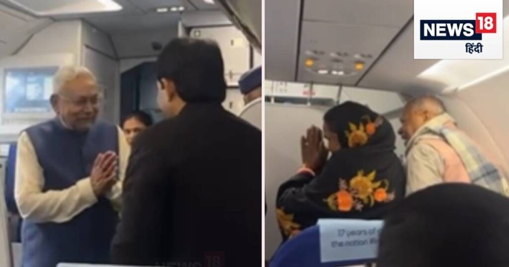 पटना से दिल्ली जाने के दौरान हवाई जहाज के अंदर पहुंचने पर मुख्यमंत्री नीतीश कुमार ने पूर्व सीएम जीतन राम मांझी और उनकी समधन और पूर्व मंत्री शाहनवाज हुसैन का हाथ जोड़ अभिवादन किया. इसके बाद नीतीश कुमार अपनी सीट पर जाकर बैठ गए. नीतीश कुमार का बीजेपी नेताओं से मुलाकात का यह वीडियो सोशल मीडिया पर वायरल है.