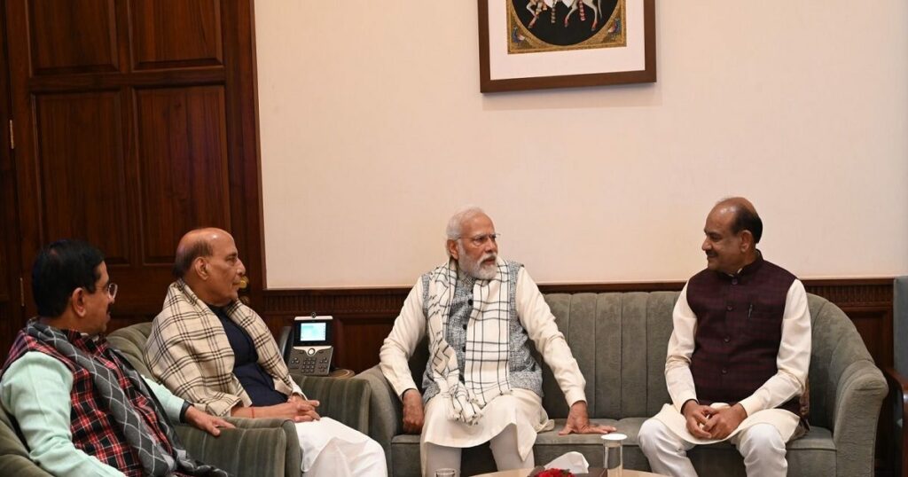 नई दिल्ली. प्रधानमंत्री नरेंद्र मोदी ने गुरुवार को लोकसभा सत्र के खत्म होने पर स्पीकर के ऑफिस में लोकसभा अध्यक्ष ओम बिरला और विपक्ष के फ्लोर लीडर्स से मुलाकात की है. इस दौरान उनके साथ रक्षा मंत्री राजनाथ सिंह, संसदीय कार्यमंत्री प्रल्हाद जोशी, अर्जुन राम मेघवाल भी मौजूद थे. वहीं, विपक्ष से बीजेडी के भरतरी मेहताब और बीएसपी के 2 सासंद मौजूद थे. वहीं, लोकसभा की कार्यवाही अनिश्चिकाल के लिए स्थगित कर दी गई है.