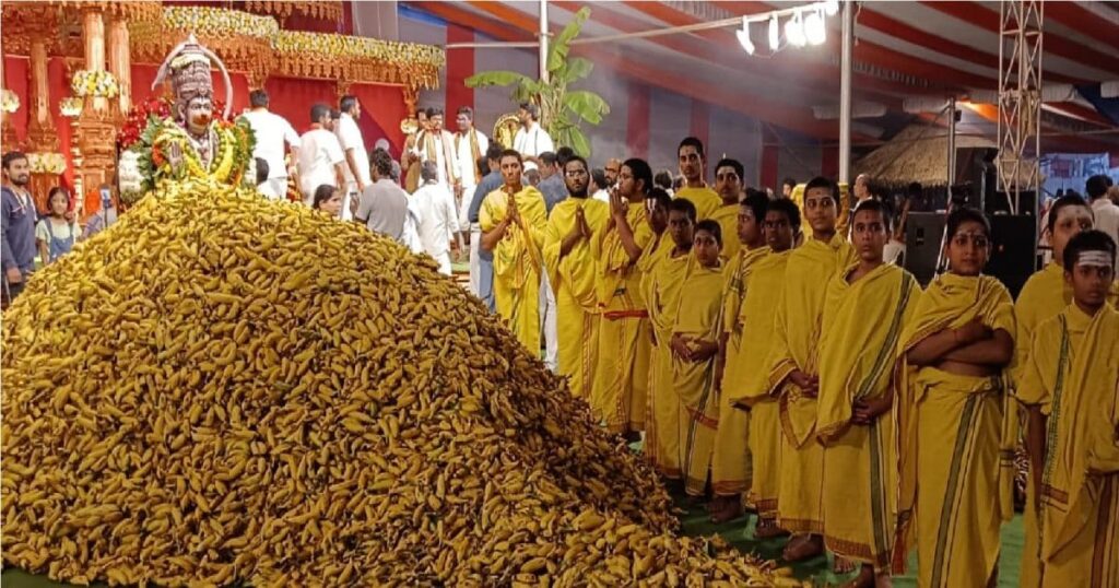 ककिनाडा (गोदावरी): हम सभी लोग अपने-अपने अराध्य को खुश करने के लिए क्या नहीं करते हैं. कुछ ऐसा ही हुआ है आंध्र प्रदेश के ककिनाडा में. यहां के हनुमान मंदिर में एक धार्मिक अनुष्ठान के दौरान भक्तों ने अपने अराध्य को 10-20 दर्जन नहीं बल्कि पूरे एक लाख केले अर्पित किए. यह अपने तरह का एक नया रिकॉर्ड है. यहां भगवान हनुमान की एक विशाल मूर्ति है. उसी के सामने ये केले चढ़ाए गए. यह मंदिर राज्य के गोदावरी जिले के काकिनाडा के श्रीपीतम में है. यह पूरा धार्मिक अनुष्ठान स्वामी परिपूर्णनंदा की देखरेख में संपन्न हुआ.